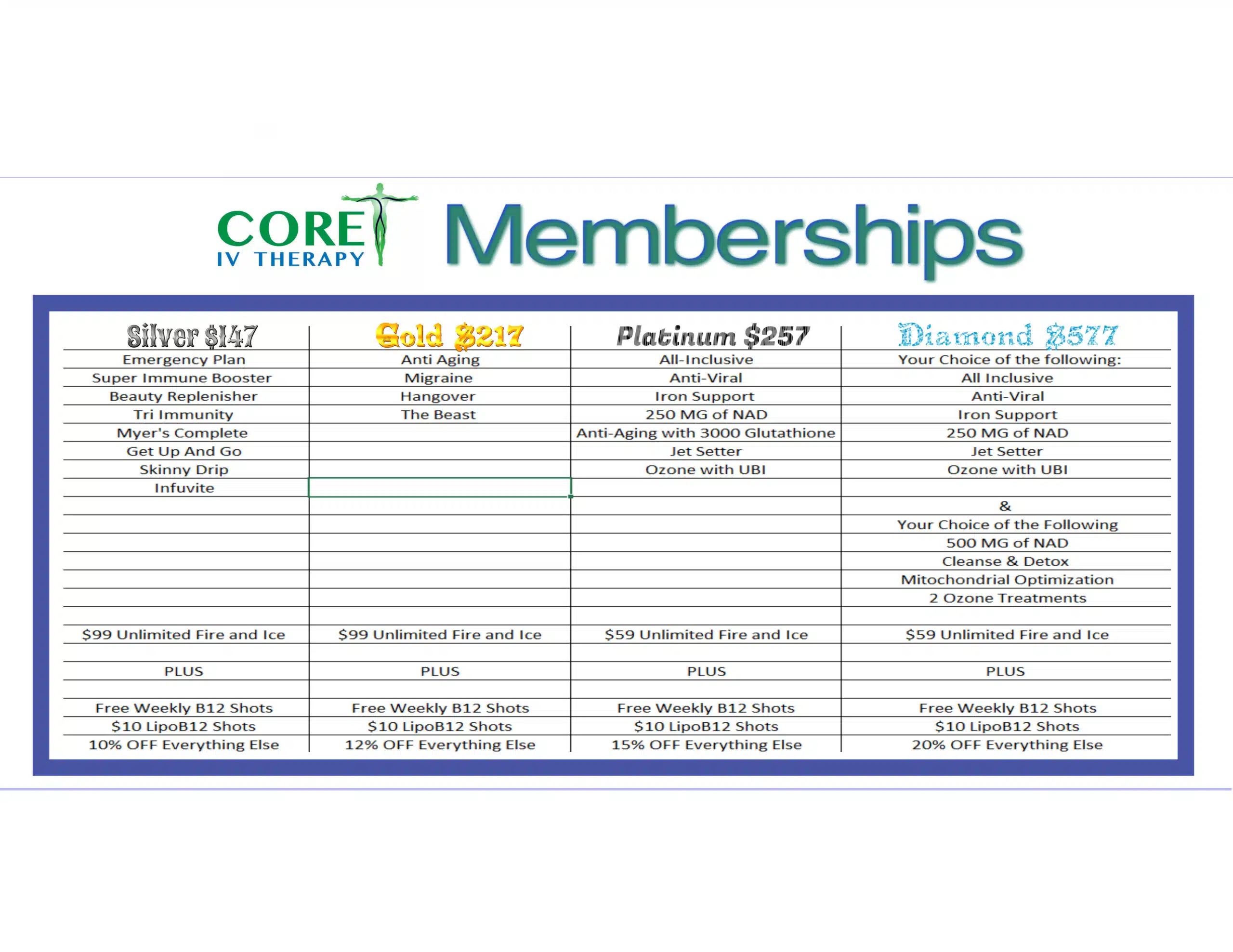 At Core iV, we like to reward our returning customers. The way we do that is with our membership program. There is no fee for our membership; it is a discount that we offer in exchange for automatic billing.